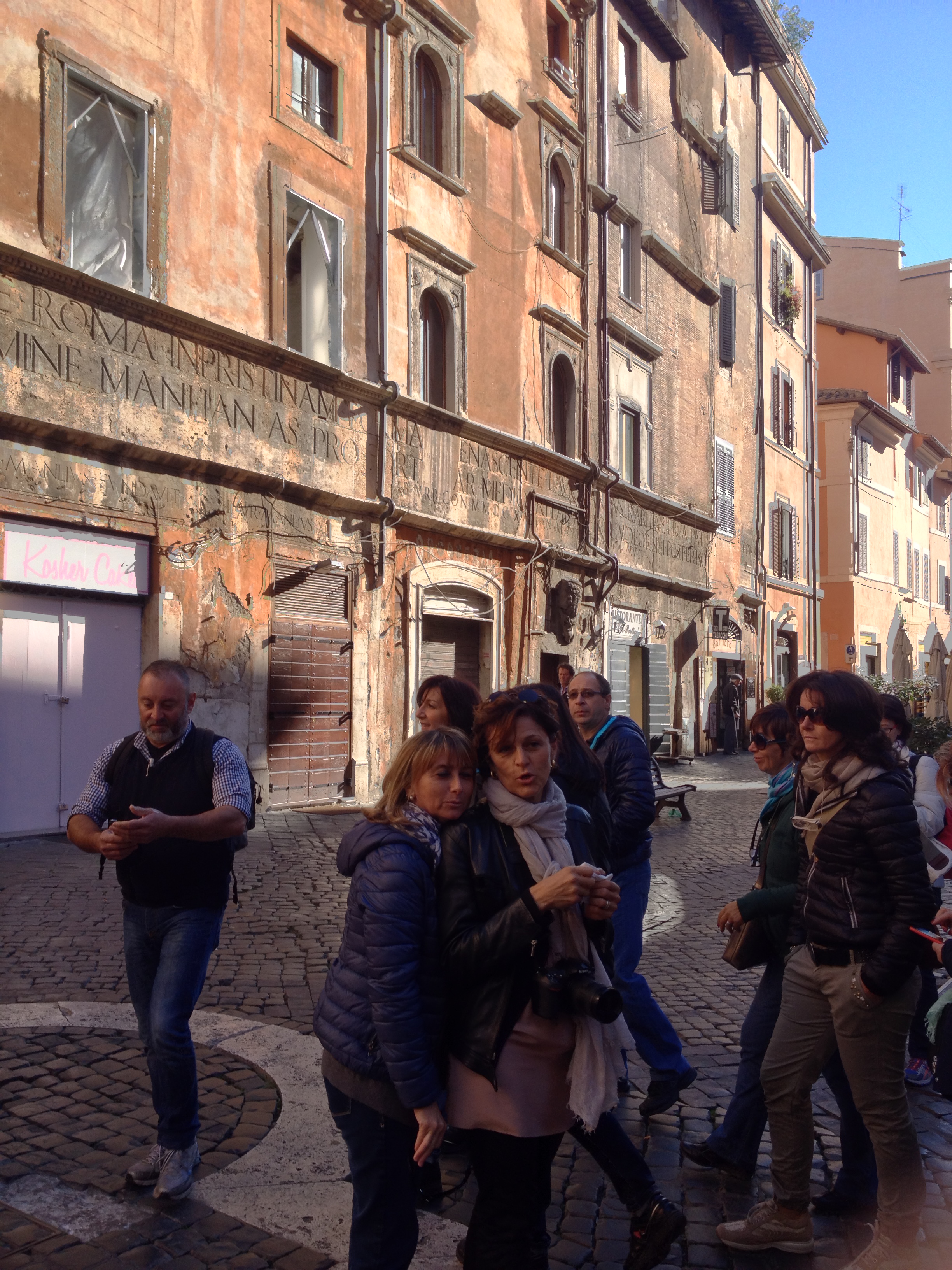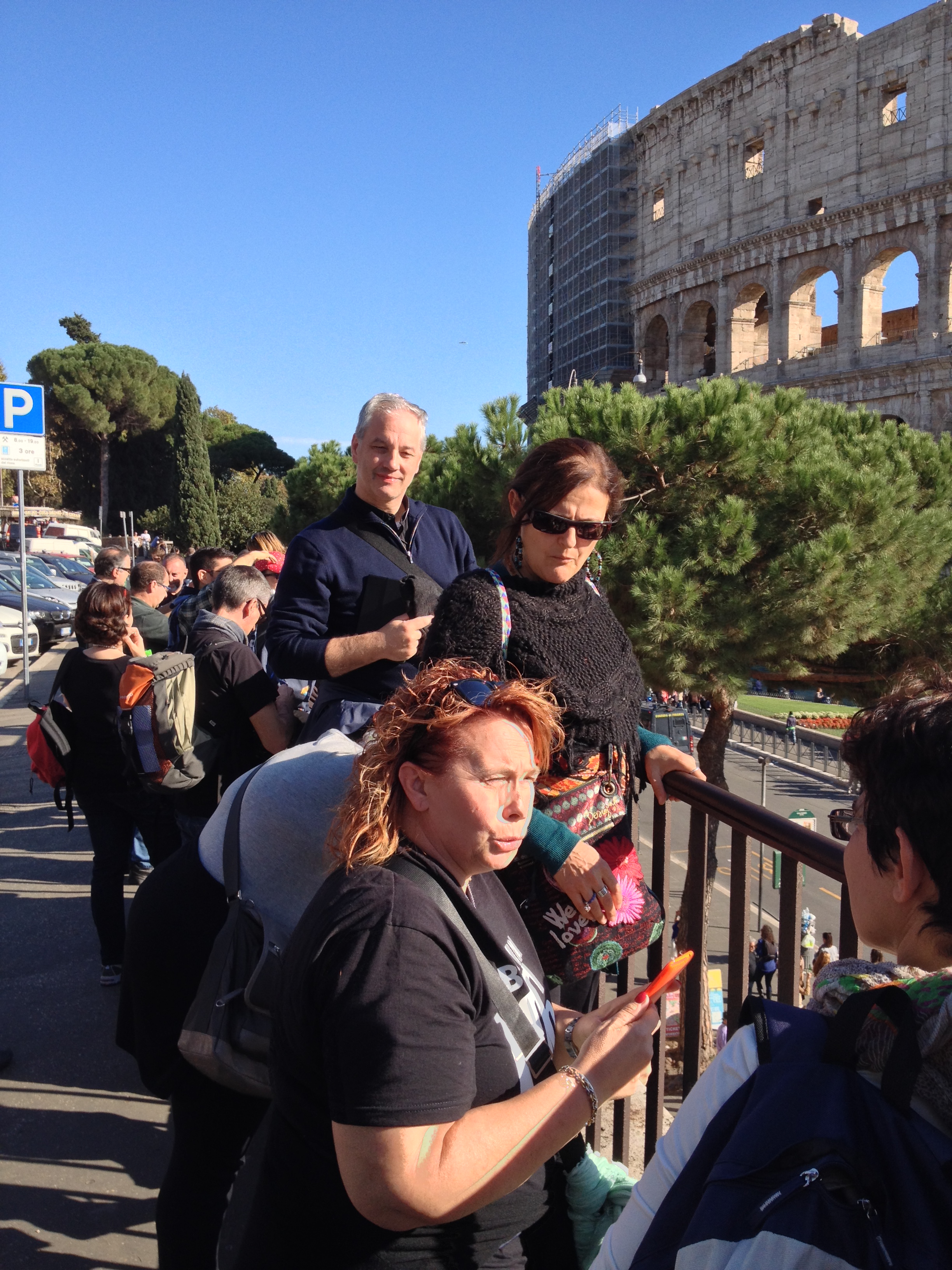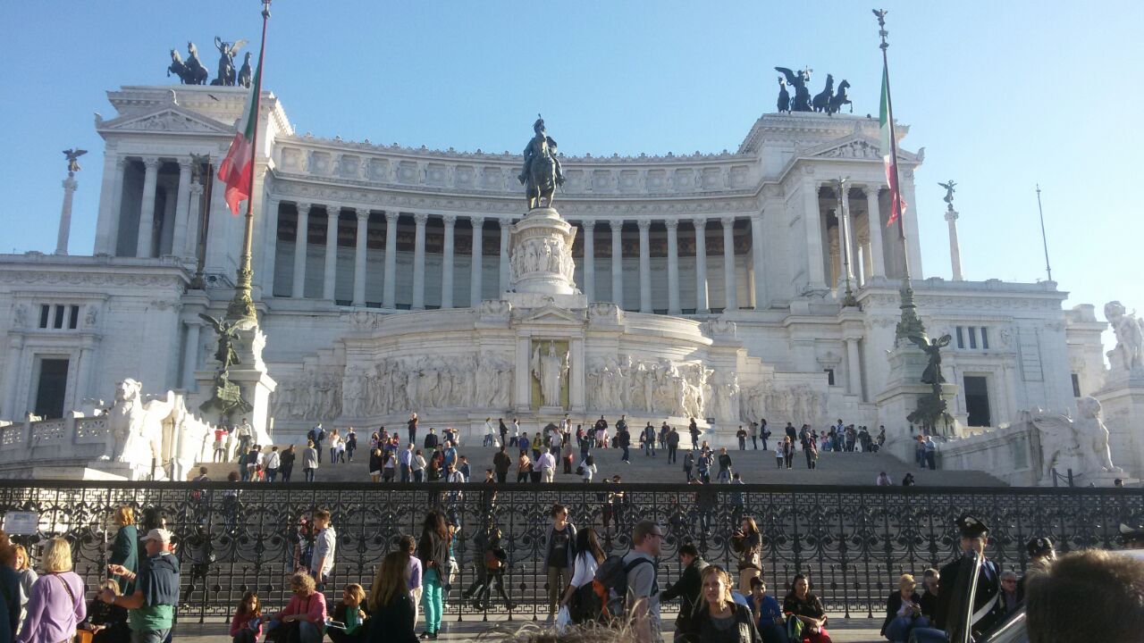 Sabato 25 Ottobre. È un giorno speciale: ciascuno è pronto per farsi immortalare sull’Altare della Patria in una foto di gruppo che indossa maglietta stampata per l’occasione e recante la scritta “1964. Aged to perfection”. E’ opportuno precisare che, quanto al termine “Aged”, si è preferito optare la più serena e politically correct traduzione “Maturati alla perfezione” invece che “Invecchiati alla perfezione”. Questione di stile… La giornata ha inizio dall’isola Tiberina e dal Ghetto ebraico. Lì il gruppo prende la volta del Circo Massimo e del Colosseo. Ma c’era da attraversare la fiumana di persone che partecipano alla manifestazione della CGIL, passando in mezzo a manifestanti urlanti, fischi assordanti e bandiere svolazzanti. Due giorni che siamo qui e ci becchiamo uno sciopero e una manifestazione. Non male.