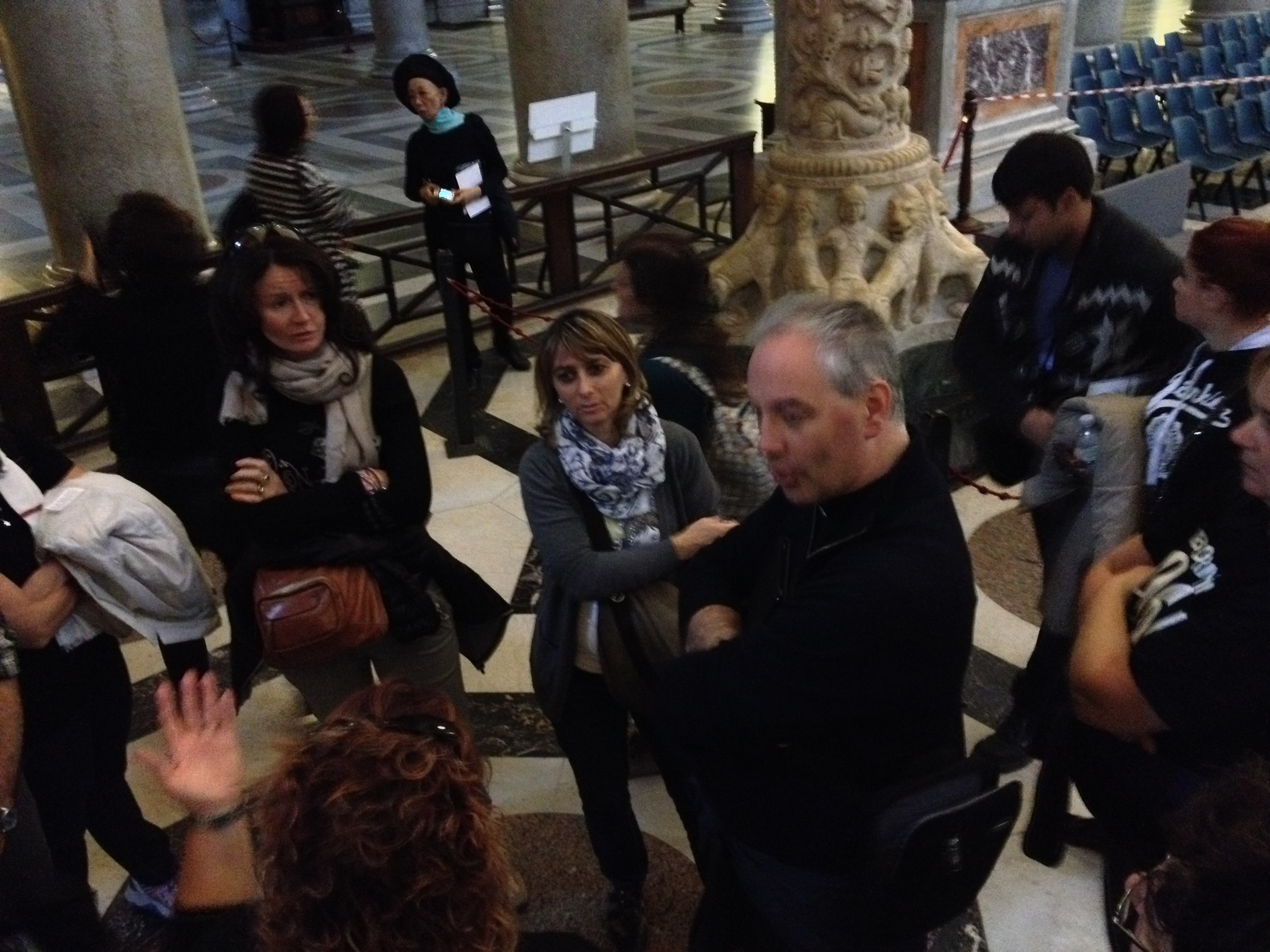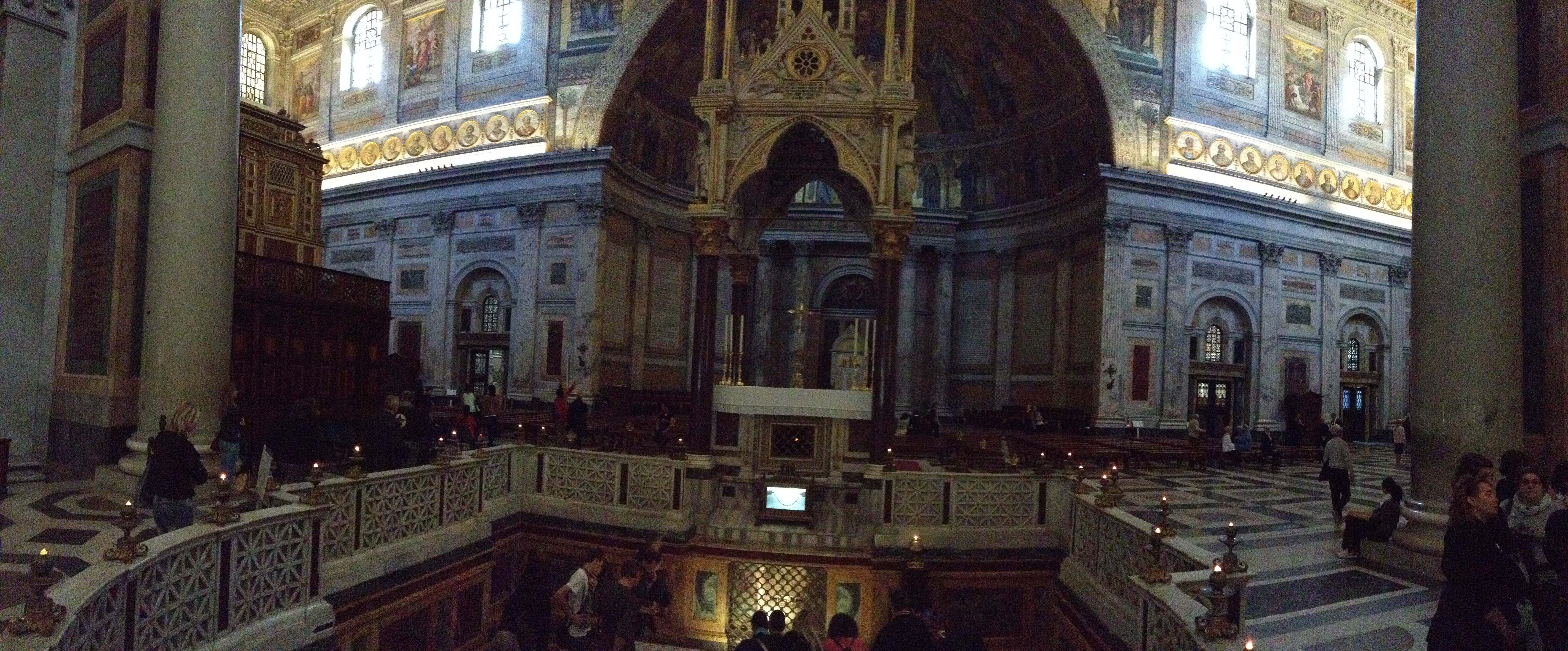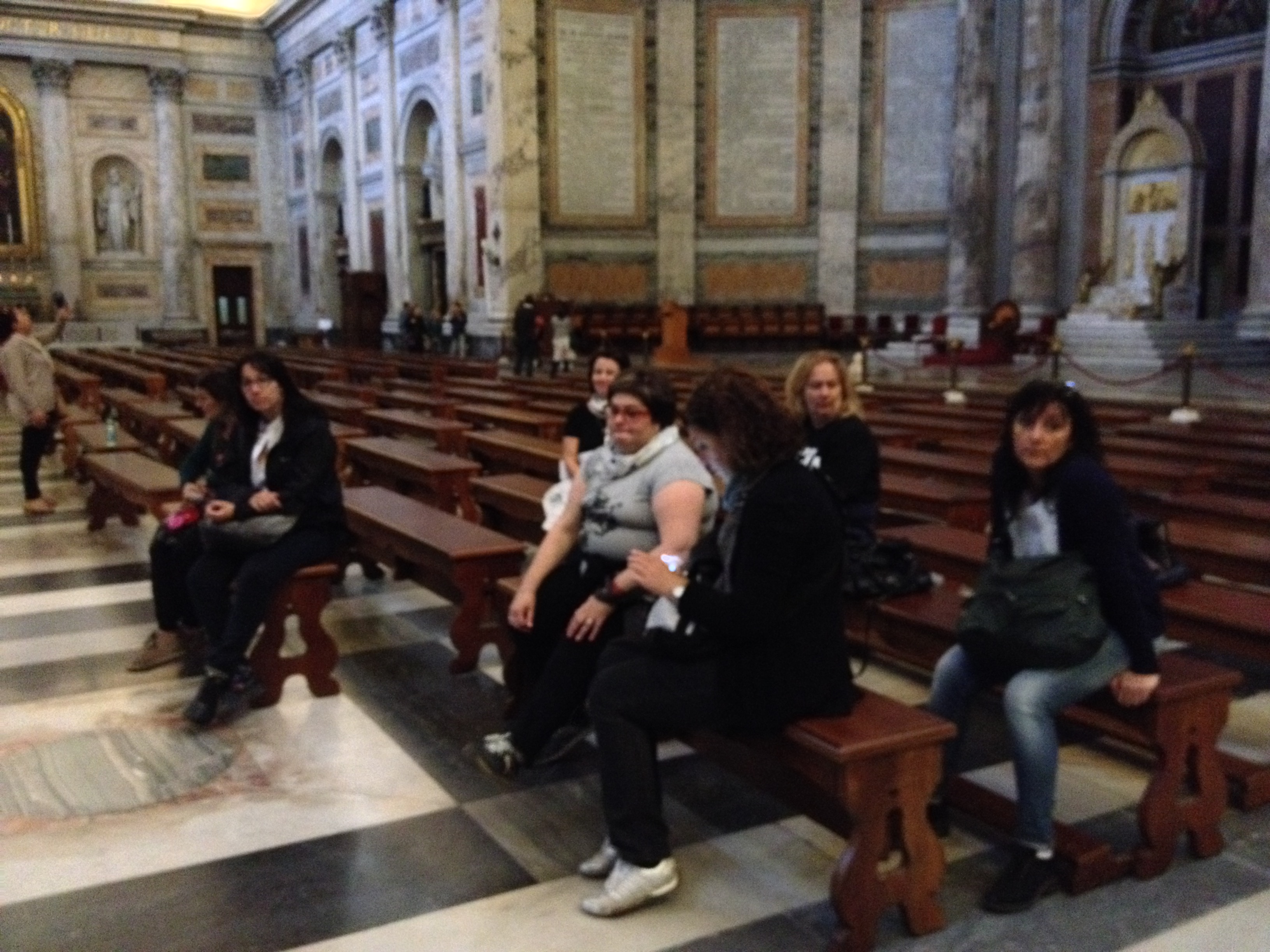 Così, rinvigoriti dalla presenza spirituale, come redivivi Mosè si apre letteralmente a metà il moderno “Mar Rosso” e ci facciamo strada. Il percorso viene variato per evitare di incontrare ancora i manifestanti e si decide di uscire da Roma. Destinazione Basilica di San Paolo fuori le mura. Immensa chiesa che ospita le reliquie di San Paolo, famosa anche per le icone raffiguranti tutti i papi fino ad ora succedutisi. Qualcuno racconta la leggenda che tra le icone ne resti soltanto una ancora da dipingere e occupare. Così il pensiero scivola verso l’idea della probabile prossima fine del mondo. Tranquilli: il buon cronista appura che sono almeno una decina, e se si vuole centinaia, i luoghi ove eventualmente dipingere i visi dei papi futuri. Fine del mondo rimandata e leggenda sfatata.