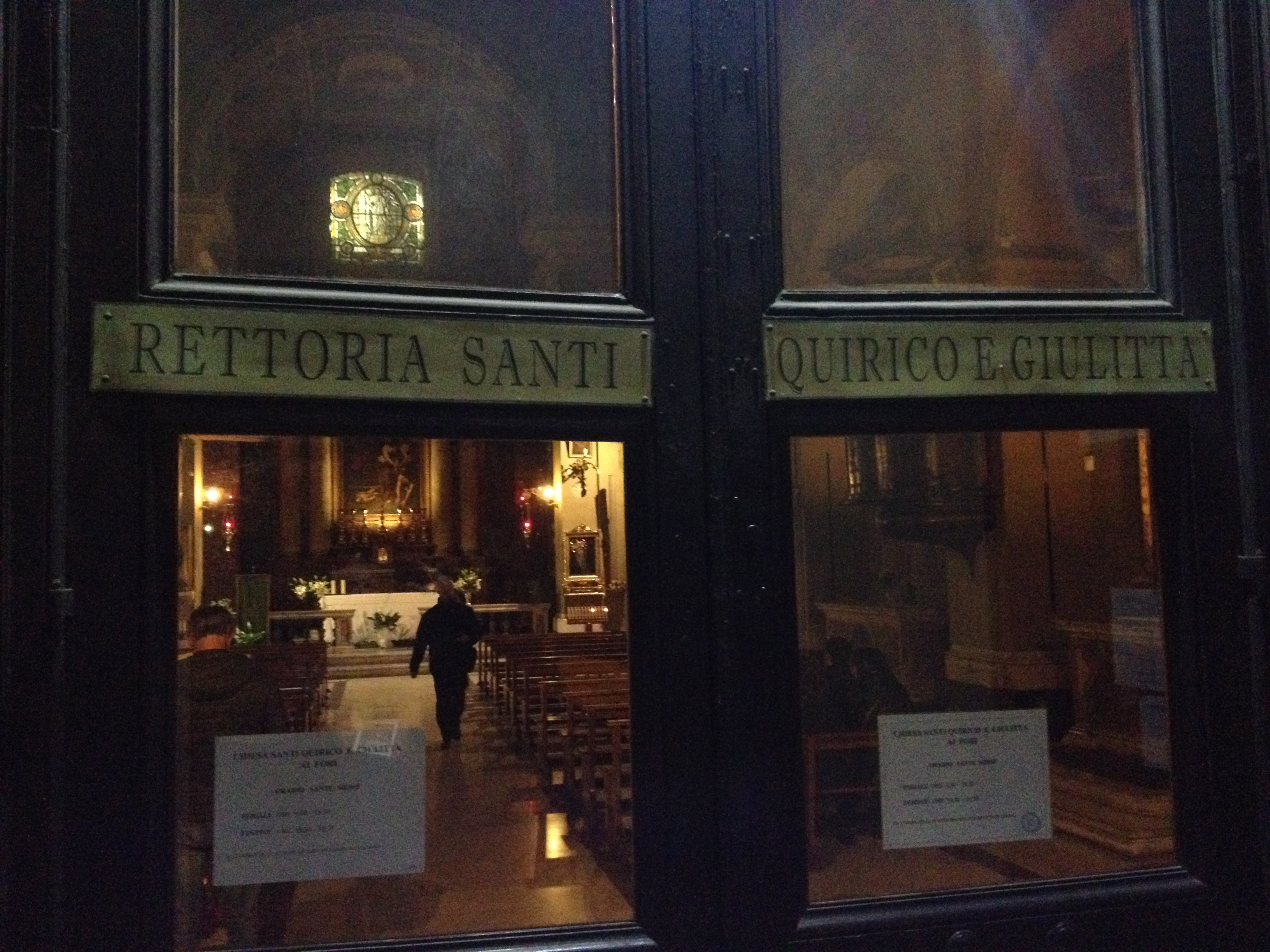 C’è il tempo per un’ultima passeggiata prima della cena che si terrà in un caratteristico locale con tanto di camerieri zelanti che, nel servire, intrattengono la clientela cantano arie tratte dalle più famose opere liriche. Così, prima di cena il gruppo si imbatte in una viuzza che ospita un bar famoso dentro al quale ogni cosa è ghiacciata a -5 gradi: tavoli, sedie, arredi e bibite comprese. Il gruppo scopre che si entra solo indossando prima un “tabarro”; così qualcuno di noi vorrebbe entrare, ma non c’è il tempo. Altri nosi appuntano il nome del locale… una insolita idea per la prossima visita a Roma. Lungo il ritorno scorgiamo una chiesa intitolata a San Quirico e Giulitta. Ancora una volta un pezzetto di Sona nella Capitale.