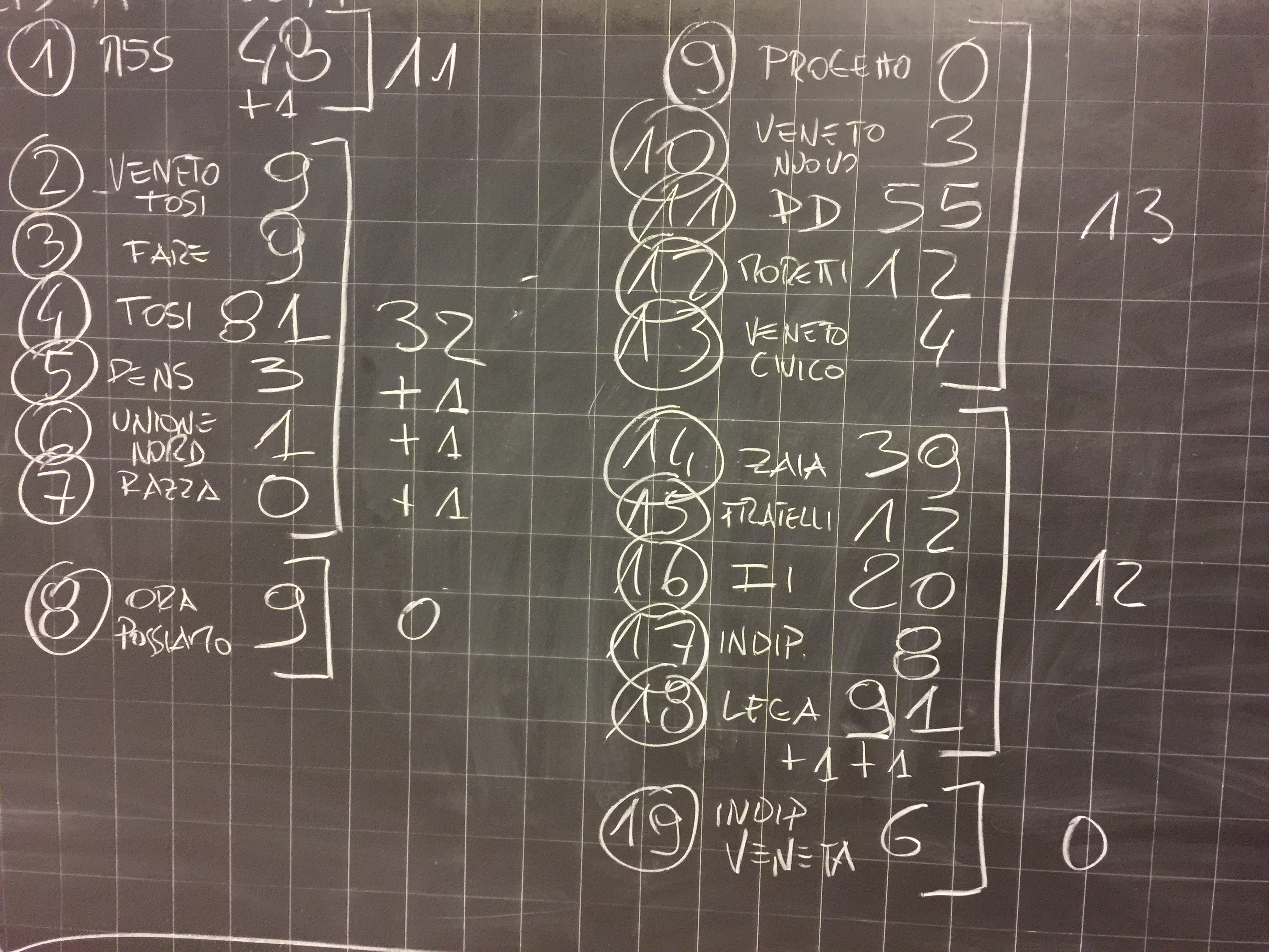 E poi, visto che le sezioni elettorali sono nelle scuole, ecco lo strumento per eccellenza: la lavagna nera con il gessetto bianco. Sistema di particolare efficienza e duttilità: durante il giorno mantiene i dati di affluenza, ma la sera si trasforma in un vero e proprio computer per calcolare i dati per i singoli partiti, le coalizioni, i voti disgiunti (questi sì che sono un rompicapo alle 2 di notte…).