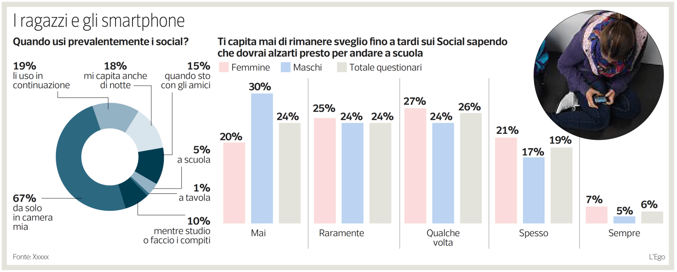 Purtroppo l’uso dei social non si limita al giorno, ma secondo L’Arena e il Corriere “Ormai il 99,3% dei ragazzi che hanno raggiunto i 14 anni è connesso. Il 67% utilizza i social da solo in camera sua. «Siamo di fronte al cosiddetto fenomeno del vampiring – ha ricordato il sociologo-. L’utilizzo del cellulare aumenta nelle ore notturne. Più di un giovane su due ha ammesso di essere rimasto sveglio fino a tardi sui social pur sapendo di doversi alzare presto per andare a scuola»”.