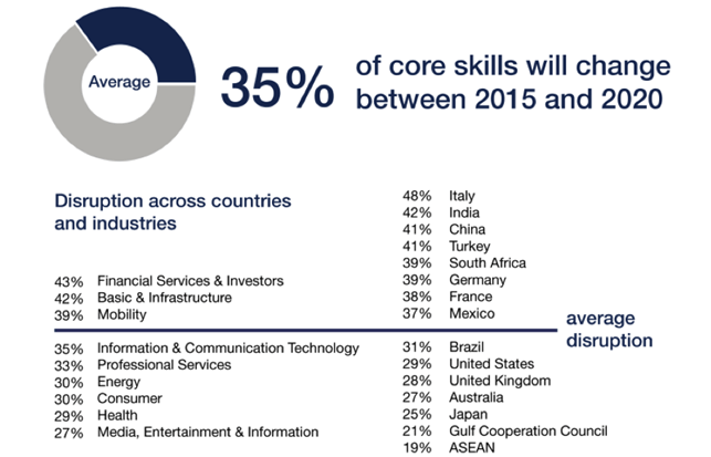 “La figura soprastante illustra la “rottura delle competenze”, ove il termine “rottura” è inteso come strappo con la consuetudine. In accordo con quanto asserito dal World Economic Forum, in pochi anni, più precisamente dal 2015 al 2020, le abilità di base dovranno essere aggiornate al passo del progresso tecnologico. Nella colonna di sinistra vengono illustrati i settori industriali maggiormente impattati, in quella di destra i singoli Paesi. Se la media generale di cambiamento delle competenze è pari al 35%, possiamo facilmente osservare come l’Italia risulti capolista con un fin troppo evidente 48%. Pertanto, possiamo asserire nel nostro Paese, nel periodo 2015-2020 (e siamo già alla metà di tale percorso temporale) dovranno essere aggiornate circa la metà delle attuali competenze, in particolare le abilità (skills), che rappresentano una fondamentale porzione delle competenze stesse. Inoltre, «si stima che il 65% dei bambini, che hanno cominciato a frequentare le scuole elementari nel 2016, andranno a ricoprire dei ruoli professionali che attualmente non esistono.» («The Future of Jobs», World Economic Forum).”