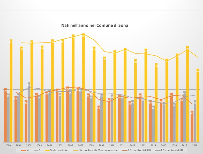 La tendenza si conosceva. Ma ora è drammatica. Nell’anno 2018 a Sona sono nate 80 femminucce e 60 maschietti. In totale, appunto, sono 140. Di per sé un numero non vuol dire nulla se non è accompagnato da una riflessione.