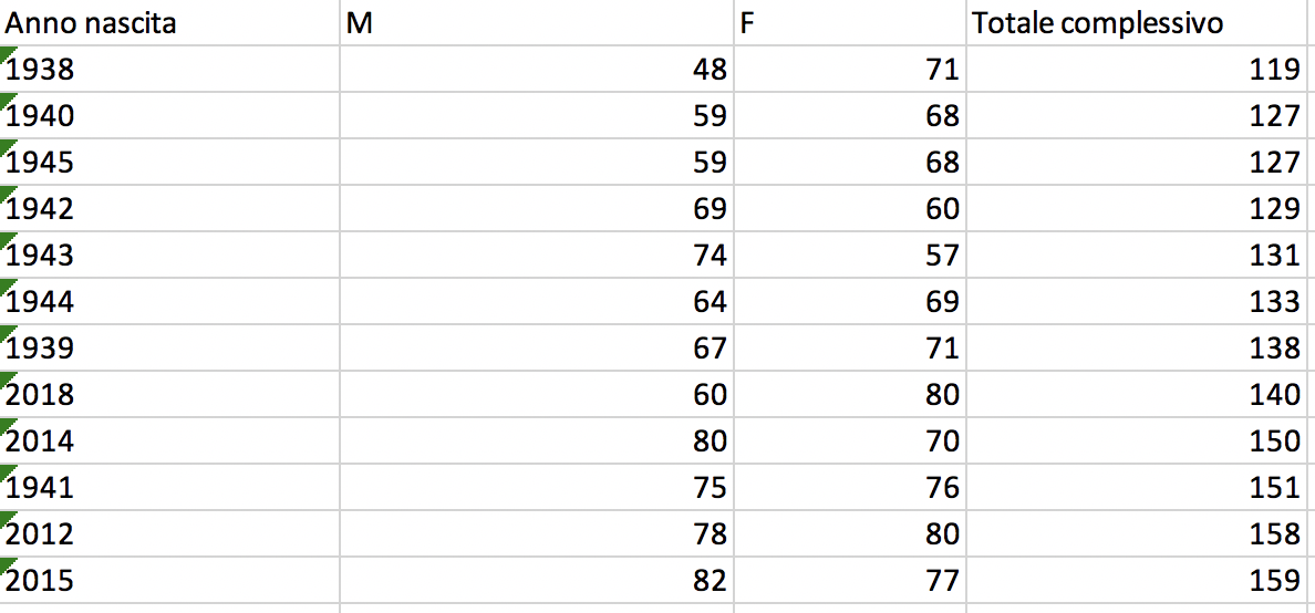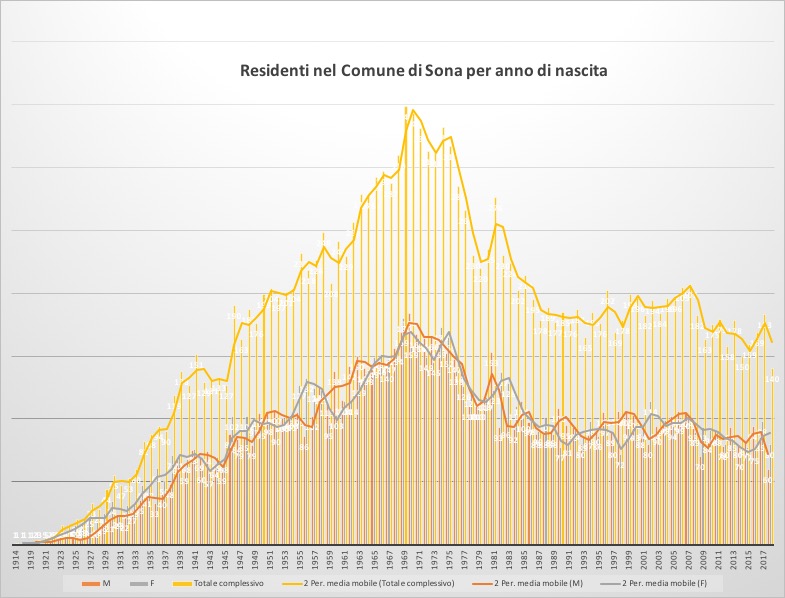 Ma la riflessione su quel numero ha aspetti forse ancor più drammatici. Centoquaranta è lo stesso dato degli attuali residenti che sono nati del tempo di guerra: se si mettono in ordine gli anni in base alla popolazione residente a Sona, si nota che l’anno 2018 (e altri tre anni della stessa decade) si incastrano proprio con gli anni della seconda guerra mondiale. Ma quello, appunto, era il periodo bellico, dove la speranza per il futuro era quasi svanita.