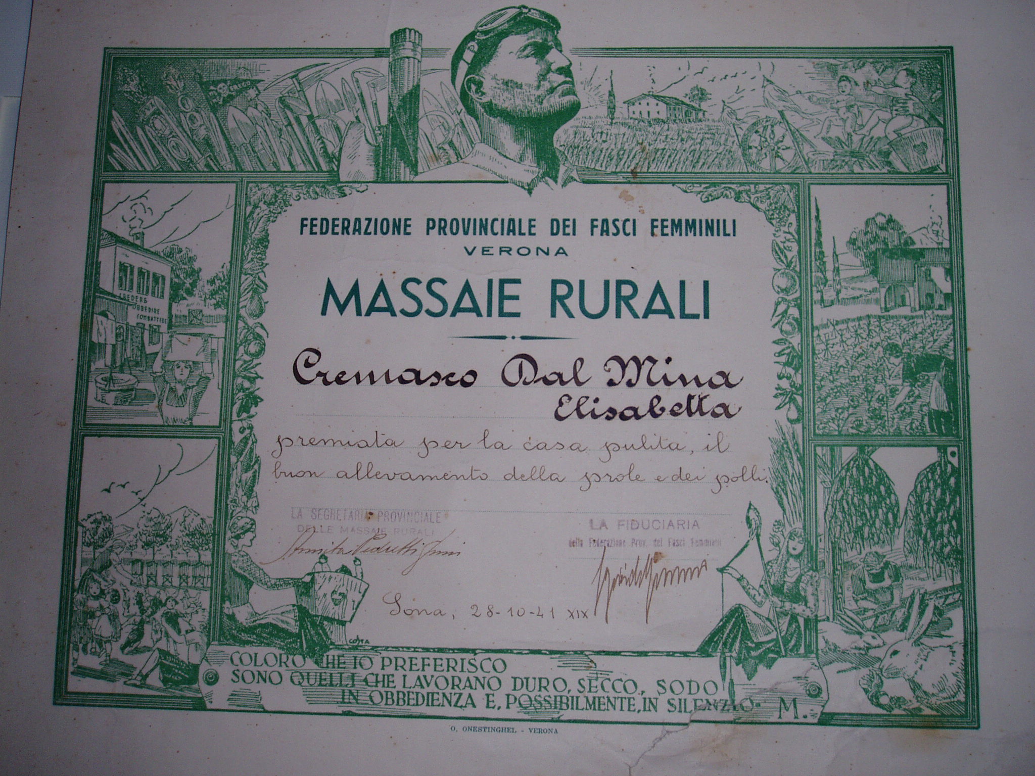Diploma rilasciato dalla Segretaria delle Massaie Rurali e dalla Fiduciaria della Federazione Provinciale dei Fasci Femminili: “Per la casa pulita, il buon allevamento della prole e dei polli. Coloro che io preferisco sono coloro che lavorano duro, secco, sodo in obbedienza e, possibilmente, in silenzio. M.”