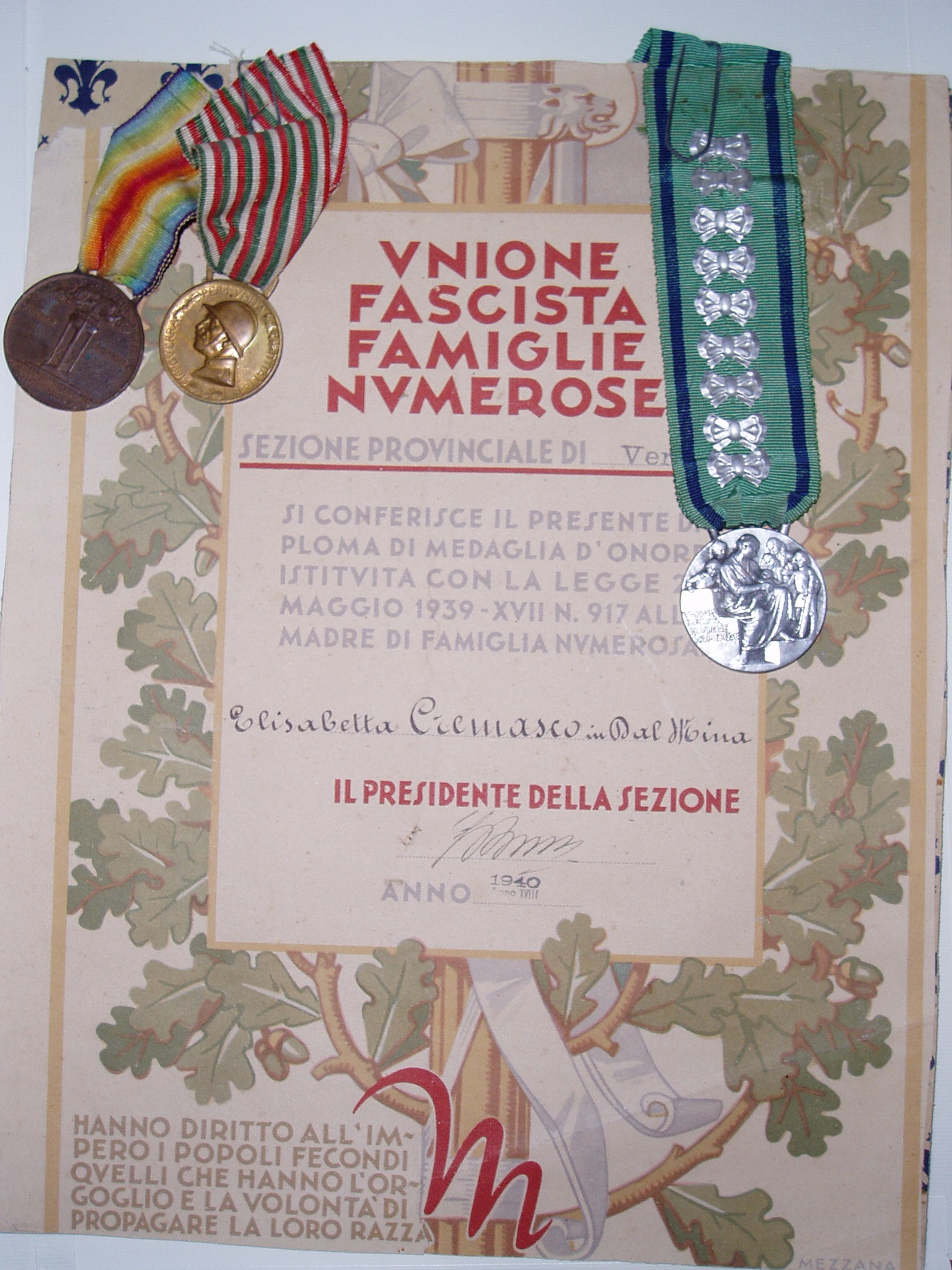 Diploma conferito dall’Unione Fascista Famiglie Numerose: “hanno diritto all’impero i popoli fecondi, quelli che hanno l’orgoglio e la volontà di propagare la propria razza.”