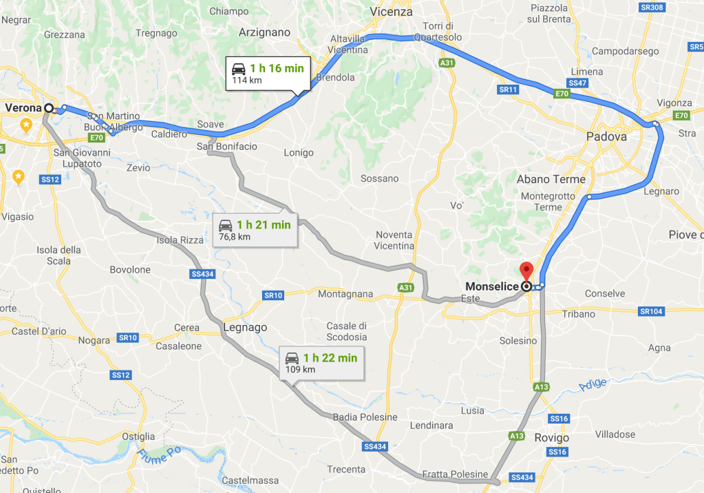 Così ho effettuato la ricerca, inserendo “Monselice” come destinazione finale, visto che la famosa città murata, vicina ad Arquà Petrarca, nasconde passeggiate di una ricchezza assoluta, come la via delle 7 chiese. Ecco il risultato di Google Maps.
