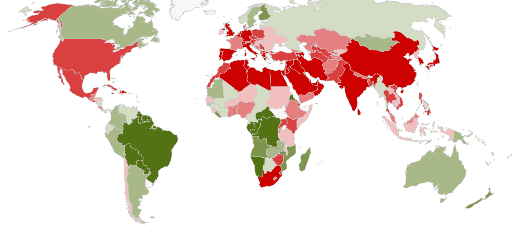 Non è solo una questione di consumo, ma di quante risorse ogni persona ha a disposizione. Quindi ci sono Paesi fortunati come il Canada che consumano veramente tanto per persona (più di 8 ettari) ma ne hanno a disposizione molti di più: ben 15. Quindi in totale consumano molto meno di quello che hanno. Analogamente l’Italia ha 0,9 di ettari per persona disponibili, ma ne consuma -appunto – 4,4.