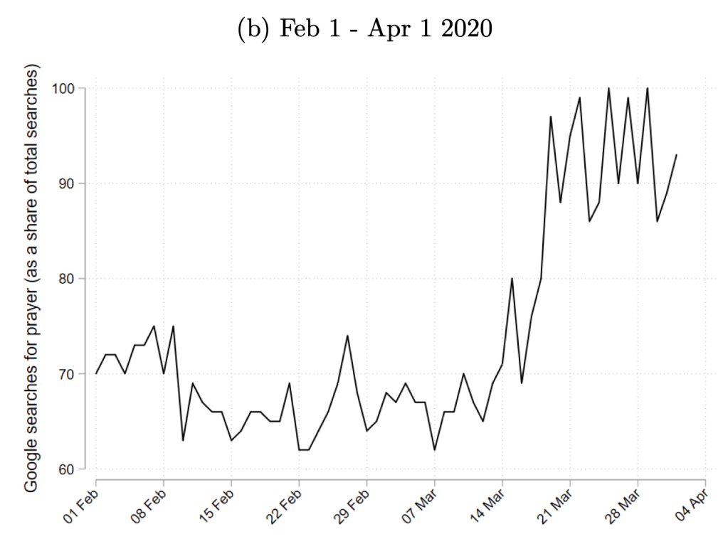 Si è verificato come analizzando le ricerche Google di 95 Paesi, la crisi legata al COVID-19 ha incrementato le domande totali sulla preghiera a livelli mai visti prima. Questo fatto è in linea con altri studi che dimostrano come l’umanità si rivolge a Dio o alla Spiritualità in generale per avere vicinanza e affrontare le avversità.