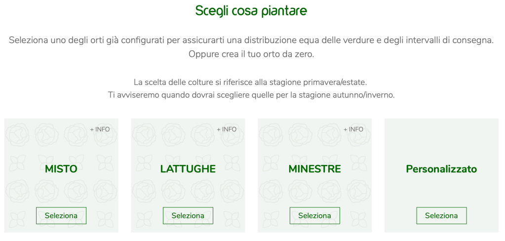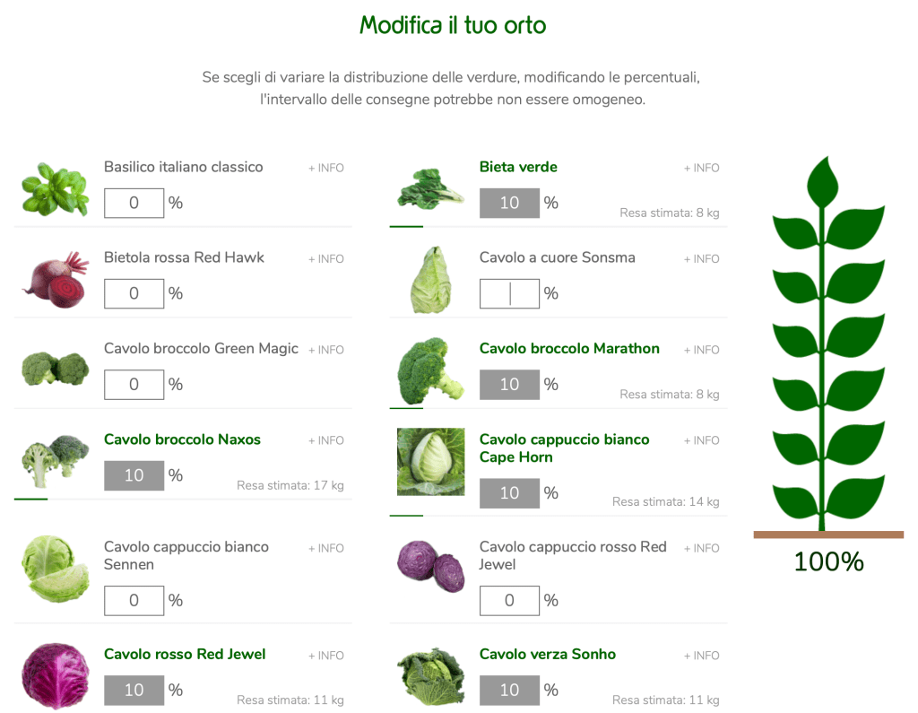 Ho scelto l’orto preconfigurato “misto” che permette di avere ortaggi e verdure di diverso tipo. Si possono sempre rivedere le scelte in modo altrettanto semplice aggiornando le percentuali di riempimento di quella particolare verdura.