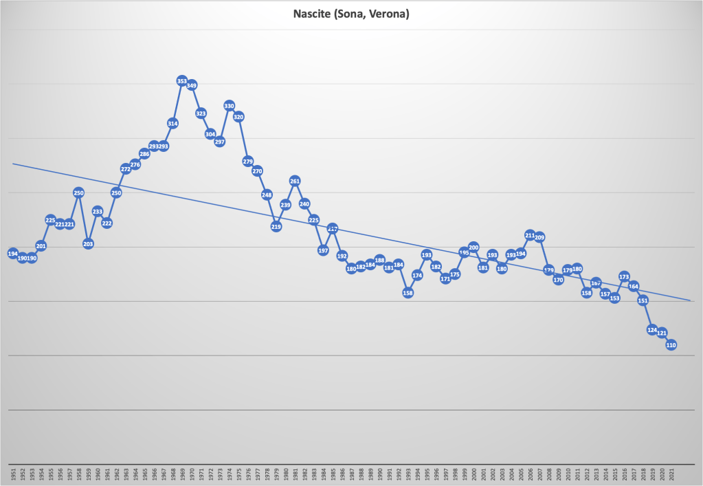Sempre nel Comune di Sona nell’anno 1969 c’è stata la maggiore natalità: 353 bambini, a fronte di una popolazione di circa 9.000 abitanti. Nell’anno 2021 i bambini invece sono stati solo 110 ma con una popolazione doppia: 18.000 abitanti. Qui sotto il grafico prendendo gli ultimi 70 anni.