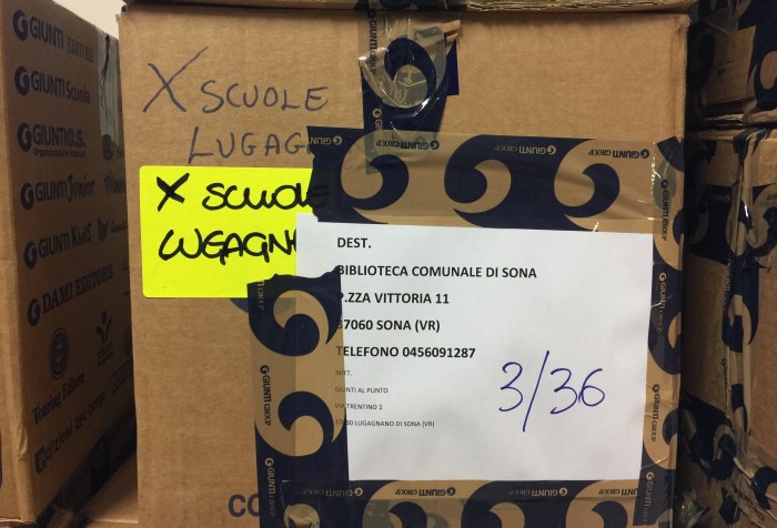 Trentasei scatole di libri arrivate alla biblioteca di Sona a seguito dell’iniziativa delle librerie Giunti “Aiutaci a crescere. Regalaci un libro”, a cui aderiamo da anni come Assessorato alla Cultura (vedi articolo … Continua la lettura di Ben 2048 libri donati alle scuole. Una montagna di sapere per rendere liberi i nostri ragazzi.