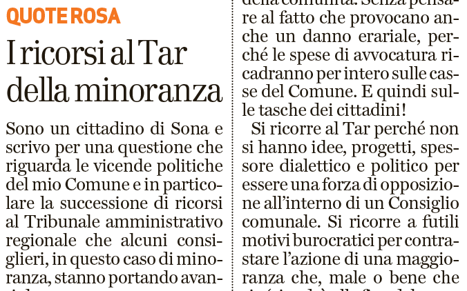Lettera a L’Arena: “I ricorsi al TAR (di parte) della minoranza”